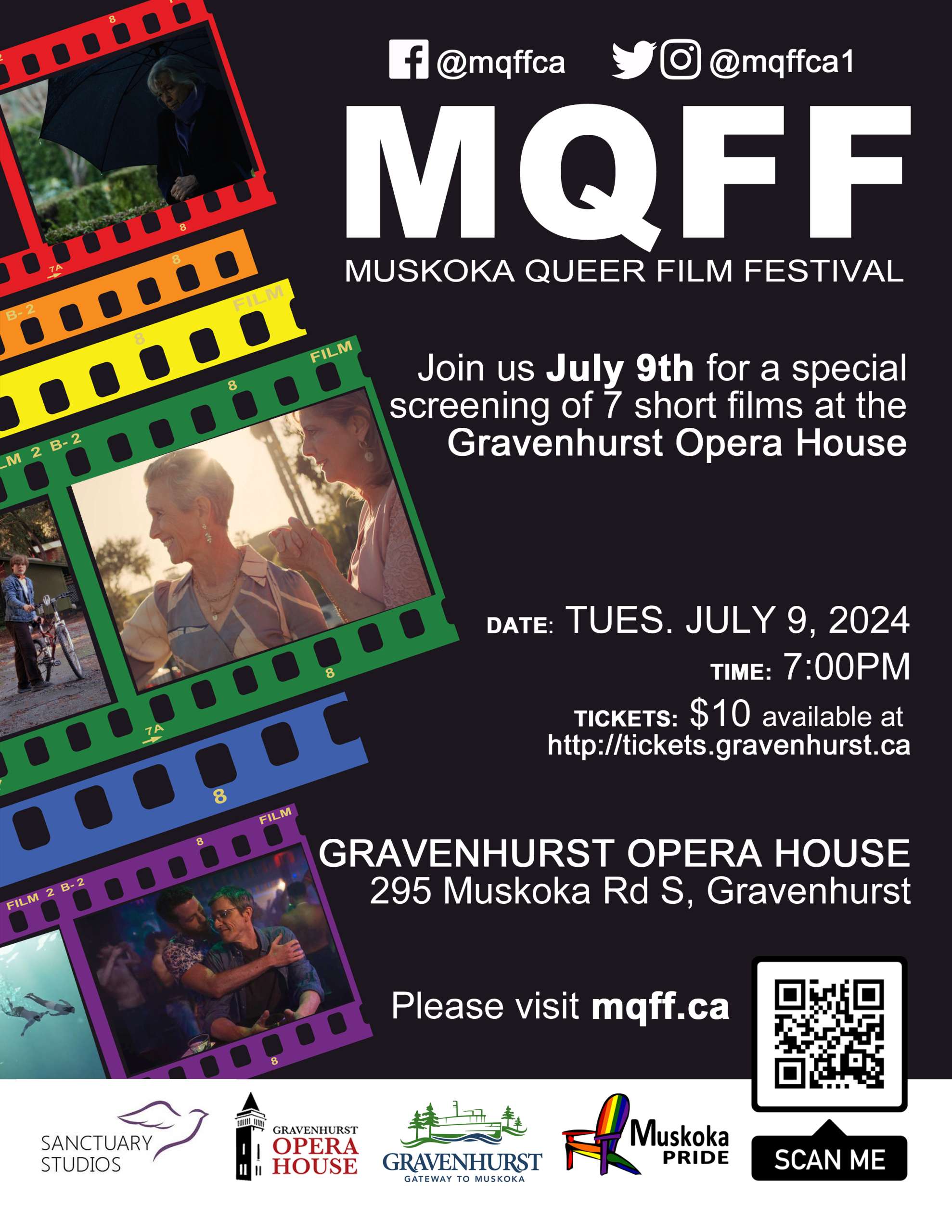 Come out July 9th to the Gravenhurst Opera House for the Muskoka Queer Film Festival. 7 short films from MQFF 2024 will be presented. Experience heartfelt stories from around the world, sharing the experiences of the 2SLGBTQ+ community. Featuring 2 films making their Muskoka premiere – “Only the Lovers” and “Quick Cuts” – plus 3 of the favourite films of the MQFF jury – “August”, “The Wake”, and “Aikane” – and 2 audience favourites from previous MQFF editions – “Sunday” and “Beauty Boys”.