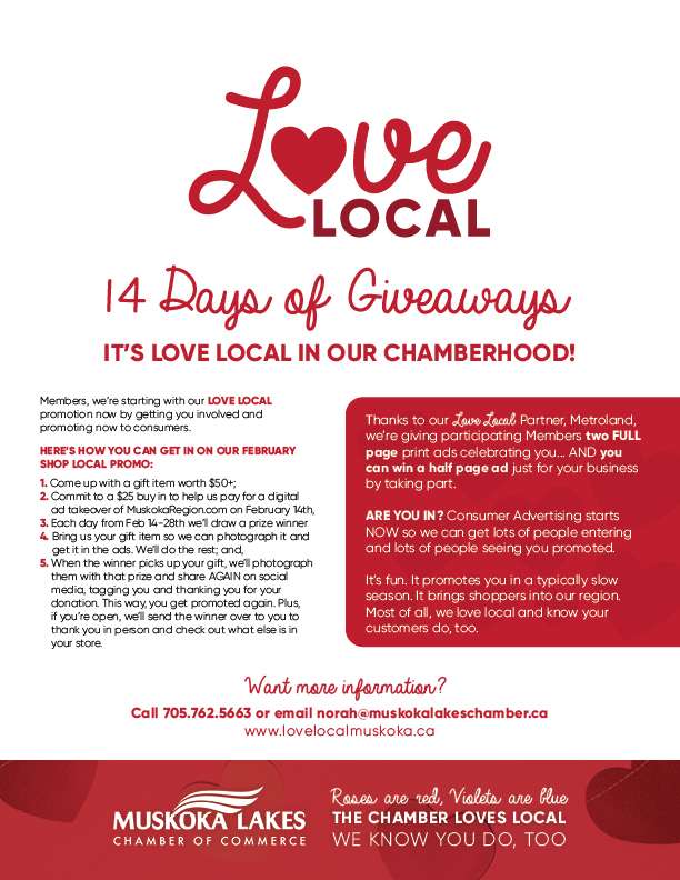 Contest Details: Shop our silent auction and your name will be entered into a draw for a prize (actual prize yet to be determined). You must be able to pick-up your prize at the Muskoka Lakes Chamber Office (3181 Muskoka Rd 169, Bala) before March 31, 2023. One entry per email address.