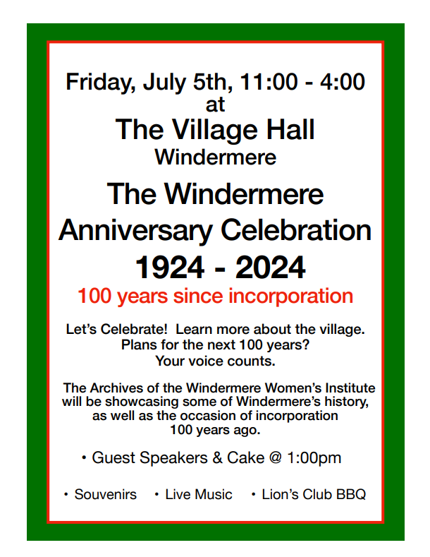 Come out and celebrate of 100 years of Windermere at The Village Hall, July 5th, 11-4pm!
