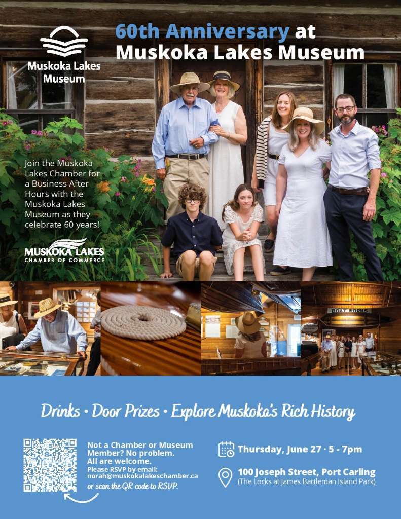 Celebrate 60 years of the Muskoka Lakes Museum at the Port Carling Locks on Thursday, June 27, 5-7pm. Register & buy tickets* for this event here: https://www.eventbrite.ca/e/60th-anniversary-celebration-at-muskoka-lakes-museum-tickets-890387913217?aff=oddtdtcreator