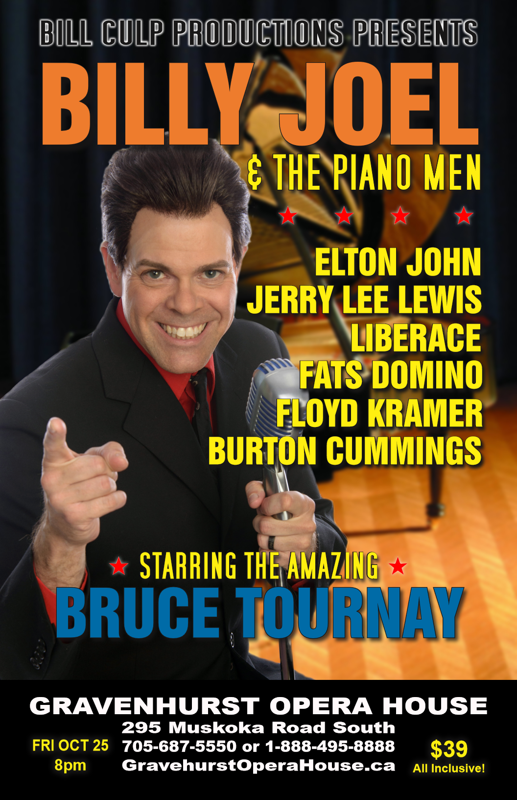 “Billy Joel and The Piano Men” celebrates the greatest piano artists of all time including Billy Joel, Elton John, Burton Cummings, Ray Charles, Jerry Lee Lewis, Nat King Cole, Liberace, Fats Domino, Floyd Cramer and more. Starring the amazing Bruce Tournay from the Memphis Cats on piano and vocals, this unique show combines fantastic live performances with costumes, humour and interesting stories relating to the music and artists being performed. You’ll hear Bruce sing many of your favourite classics including “Piano Man,” “Crocodile Rock,” “Great Balls of Fire,” “My Own Way To Rock” and “Blueberry Hill” amongst many other timeless piano classics!