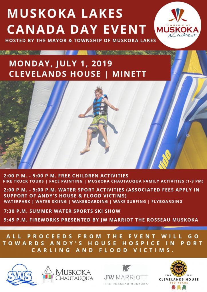 Come to Minett for hands on Arts Activities for the whole family! Featuring art by Brittany Johnston, performance by Jam Sandwich, and a drum circle led by Basa in the afternoon. Then there’s the ski show and fireworks at dusk. The entire day is presented by the JW Marriott The Rosseau Muskoka Resort & Spa, the Township of Muskoka Lakes, Summer Water Sports, Muskoka Chautauqua, and Clevelands House. Monies raised from discounted water activities will go to Andy’s House and flood victims. See the poster for full details below.