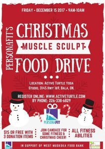 PersonaFit’s Candace Wiese offers a free muscle sculpt class with the donation of 3 food bank items. It all happens Friday, December 15 from 9-10am at Active Turtle Yoga’s Namastay in Muskoka studio at 3145 Hwy 169, Bala.