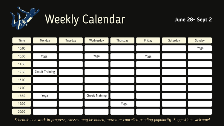 Classes are held outdoors with a tent available for rain days. Dress appropriately. We ask that you bring your own mat, but do have some to borrow if need be.