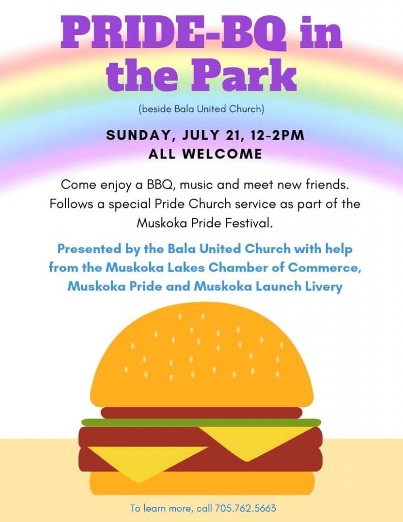 Come enjoy a BBQ, music, and meet new friends from noon-2pm. Follows a special Pride Church service at 11.15am as part of the Muskoka Pride Festival.