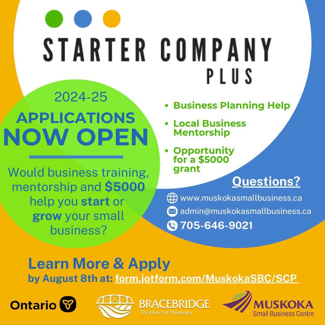 The Muskoka Small Business (MSBC) is happy to announce the return of Starter Company Plus, business training, mentorship and $5000 grant program. The approximate 10-week program will begin mid-September. To find out whether your new or existing business could qualify, how the program runs, and to apply, visit: https://form.jotform.com/
