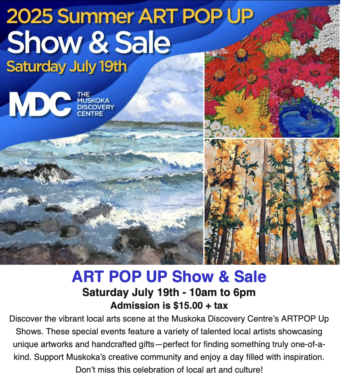 Muskoka Discovery Centre 275 Steamship Bay Road, GravenhurstCome out to the Muskoka Discovery Centre for their Summer Art Pop Up Shows! Schedule is listed below! June 21st July 19th August 16th Open from 10am-6pm. More information to come soon.