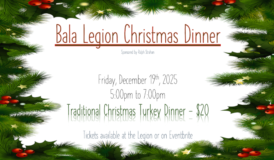 Bala Legion 1011 Maple Ave, Bala, ON P0C 1A0Traditional Christmas Turkey Dinner- $20 Tickets available on Eventbrite.