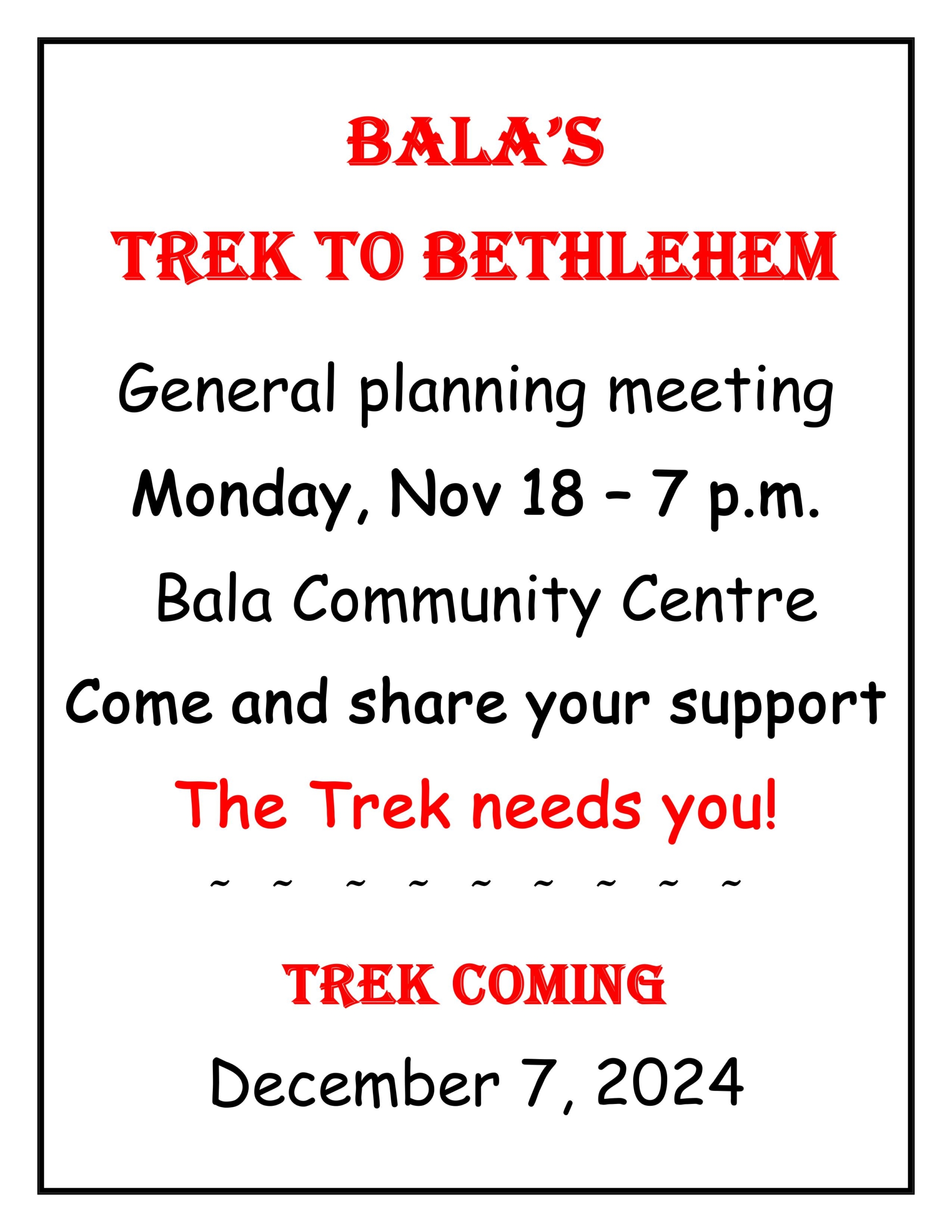 Bala Community Centre 1008 Maple Ave, Bala, Ontario, CanadaGeneral Planning Meeting November 18, 7pm Bala Community Centre Come and share your support