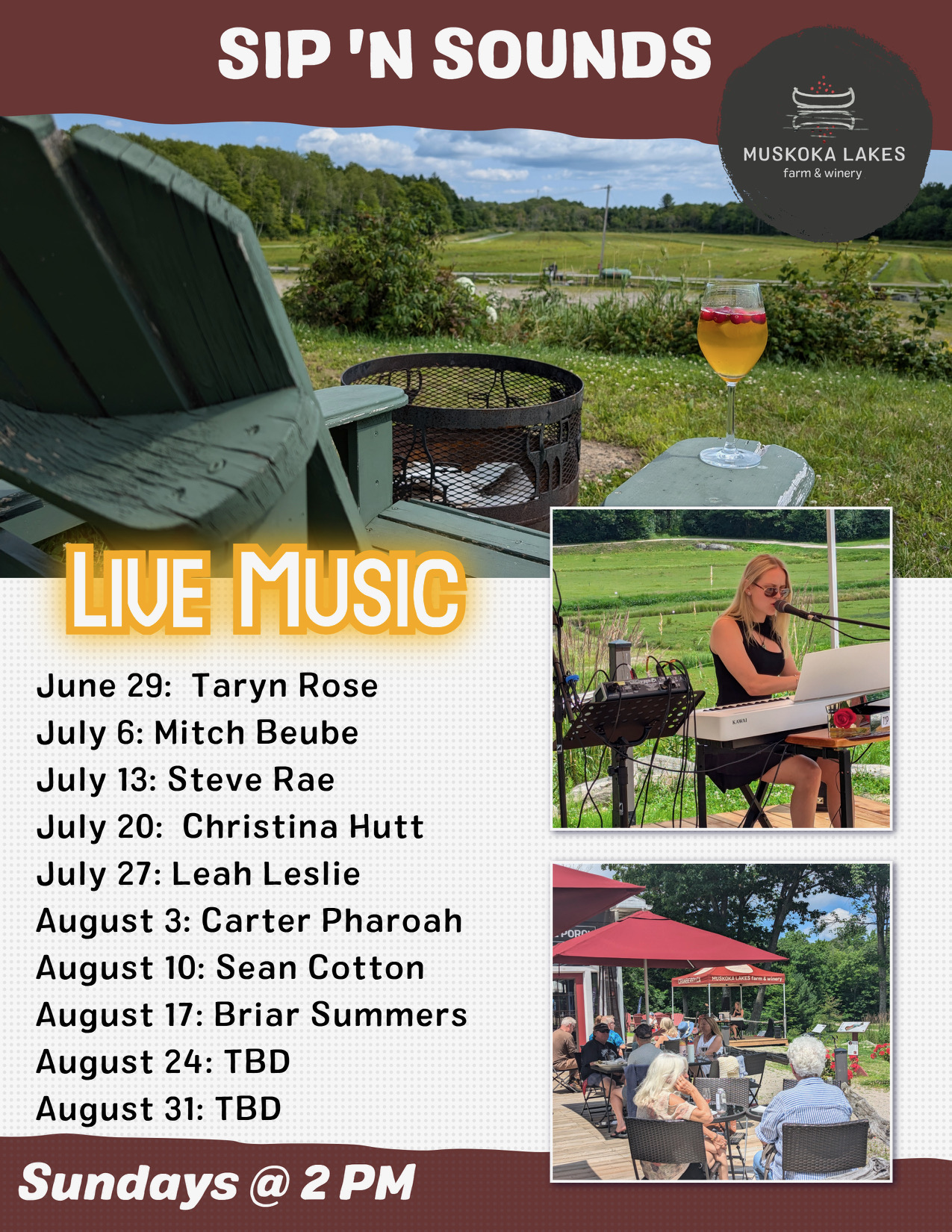 Sip 'N Sounds returns again at the Muskoka Lakes Farm and Winery. On July 27th starting at 2pm, enjoy live music from Leah Leslie. |