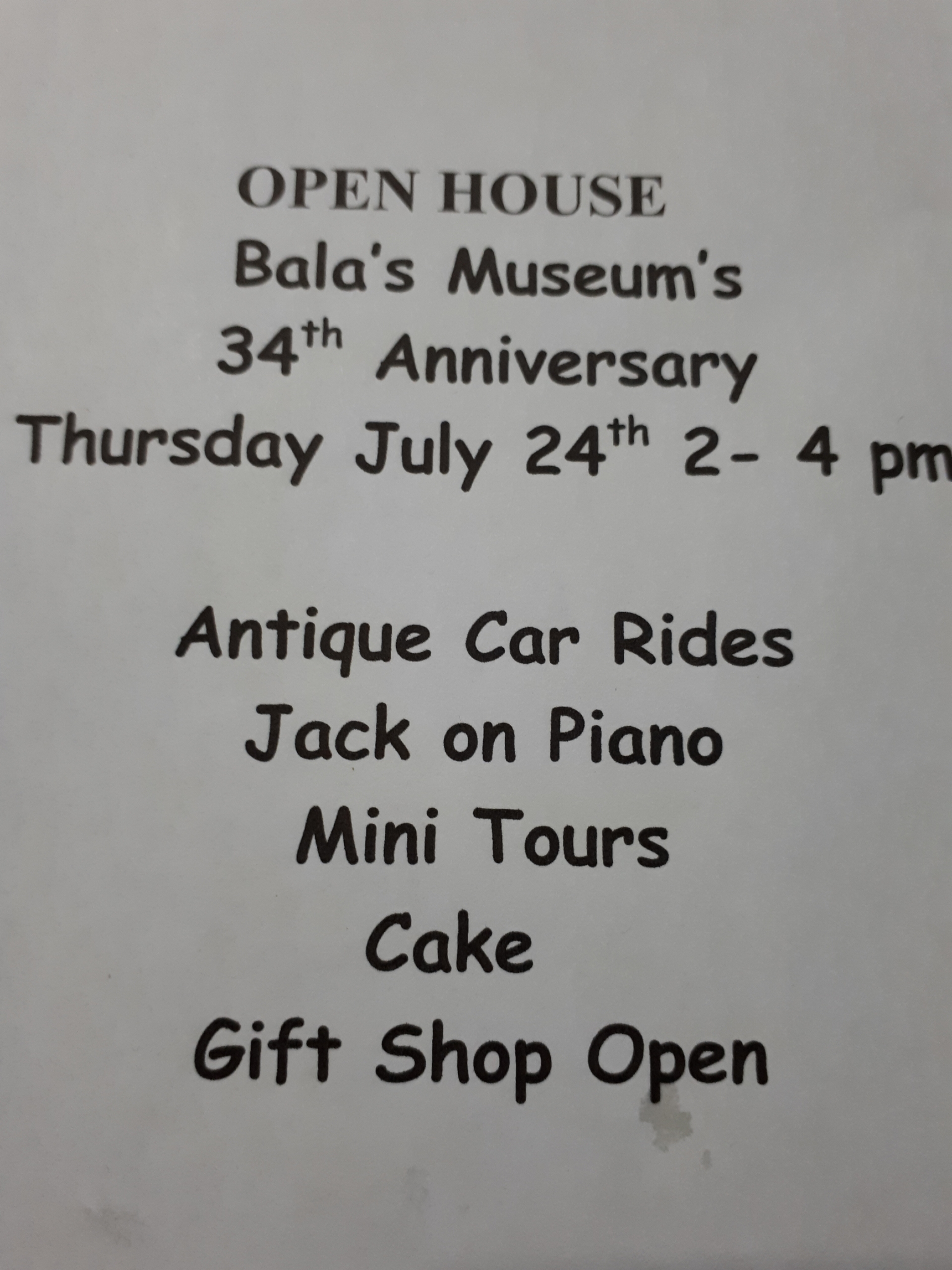 Come out July 24th for the 34th Anniversary Celebration of the Bala Museum. Enjoy a variety of activities for all ages. |