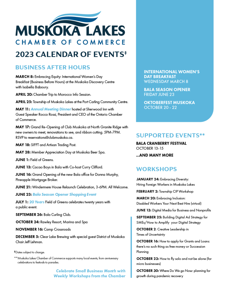 The Muskoka Lakes Chamber of Commerce is ready to welcome you and start promoting your business through its network of Chamber members and beyond. We’re all about supporting local business and helping our communities thrive. Discover the additional benefits of membership here.