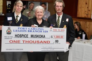 that proceeds from their annual gala this year would go to Andy’s House AND the Port Carling Legion surprised Hospice Muskoka with a cheque for $1,000 toward Andy’s House, which is expected to be open in Fall 2019.