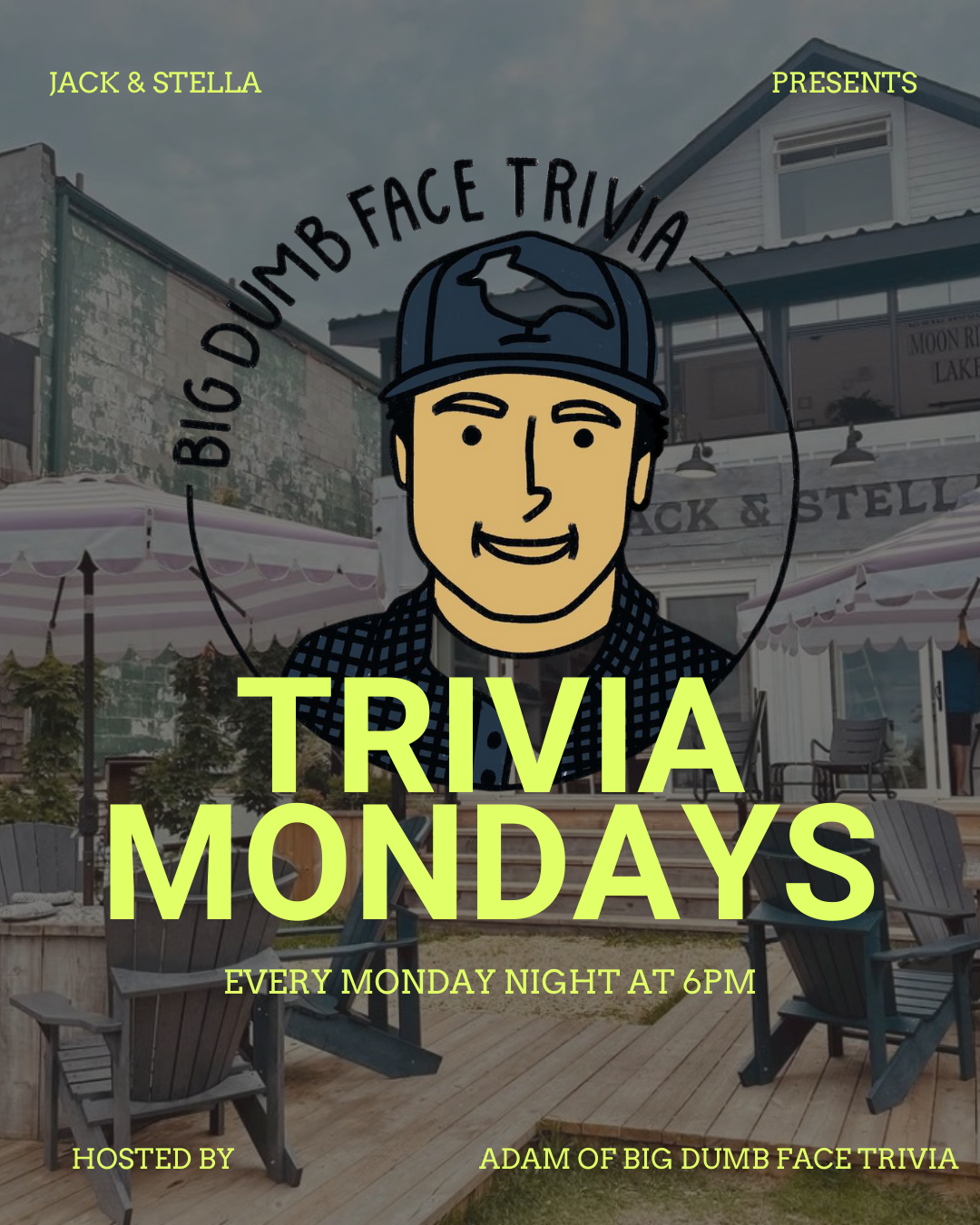 On Mondays 6-9PM, join Jack & Stella for Trivia Night along with Adam from Big Dumb Face Trivia!   Teams will be a max of 4. Walk ins welcomed, but booking in advanced is highly recommend.
